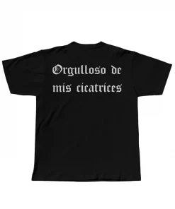 Camiseta de manga corta y cuello redondo en color negro. Serigrafía delantera a la altura del pecho (Natos y Waor) y trasera (Orgulloso de mis cicatrices).