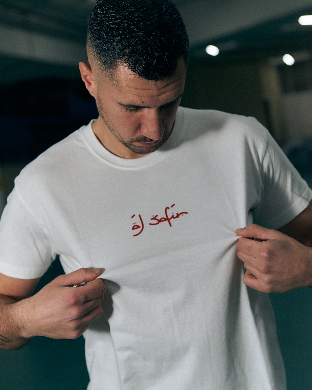 Camiseta de manga corta en color blanco, cuenta con dos serigrafías en color rojo, una delantera en el pecho con el logo de Al Safir y otra grande en la espalda con el diseño del Caballo Ganador.