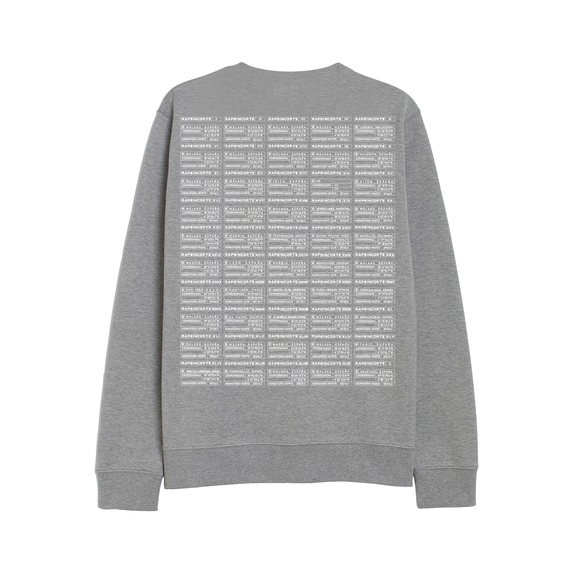 Sudadera en color gris sport, sin capucha ni bolsillos. Cuenta con serigrafía delantera, a la altura del pecho, y en la espalda, con la ubicación de cada Rapsincorte.